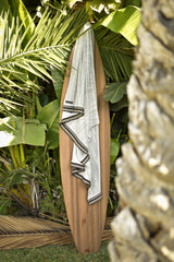 The Grey Skies Sparkle Bombay Wrap is a stylish beach towel made of yummy soft French Terry with versatility galore. Wear it as a poncho, sarong, side shoulder “dress,” or simply to wrap up after a swim. The luxurious rhinestone trim and pleated grosgrain ribbon adds that special touch to your beach wardrobe and is a summer and vacation “must have!”