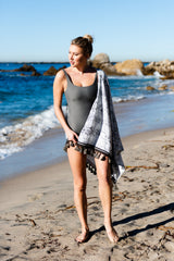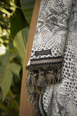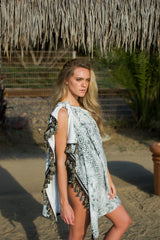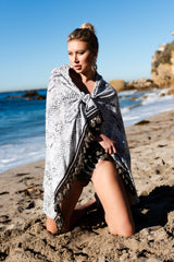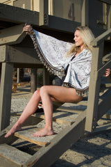 The Python Bombay Poms Wrap is a stylish beach towel made of yummy soft French Terry with versatility galore. Wear it as a poncho, sarong, side shoulder “dress,” or simply to wrap up in after a swim. The luxurious pom pom trim adds that special touch to your beach wardrobe and is a summer and vacation “must have!”